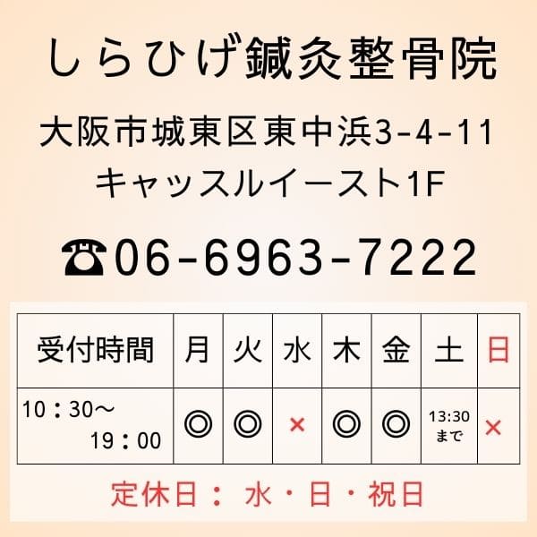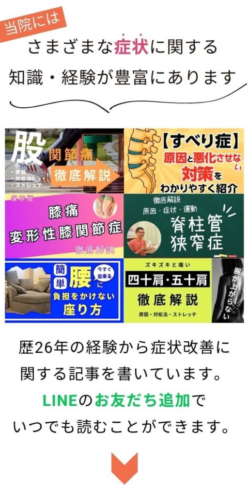 例えば、「筋肉の張り」「関節の潤滑不全」「骨盤・腰椎の動きの低下」「連鎖運動の低下」「インナーマッスルの低下による関節の不安定性」など、体の機能的な問題を改善していくことで、症状が改善する見込みが考えられます。